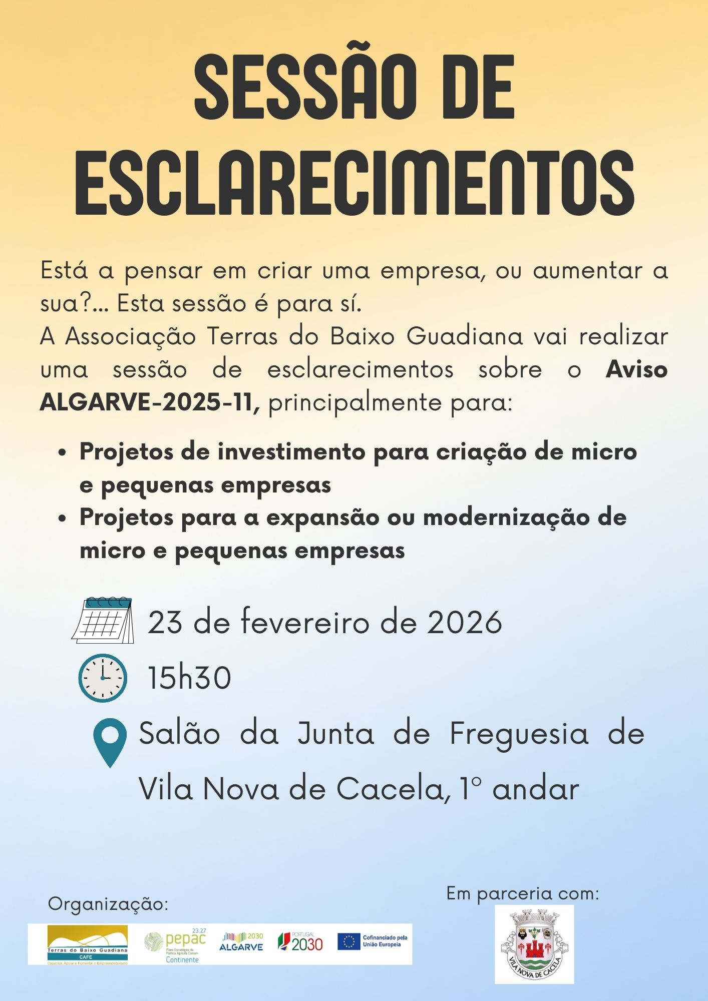 A Associação Terras do Baixo Guadiana vai realizar uma sessão de esclarecimentos, sobre o Aviso ALGARVE-2025-11, no âmbito do projeto CAFE, principalmente para: